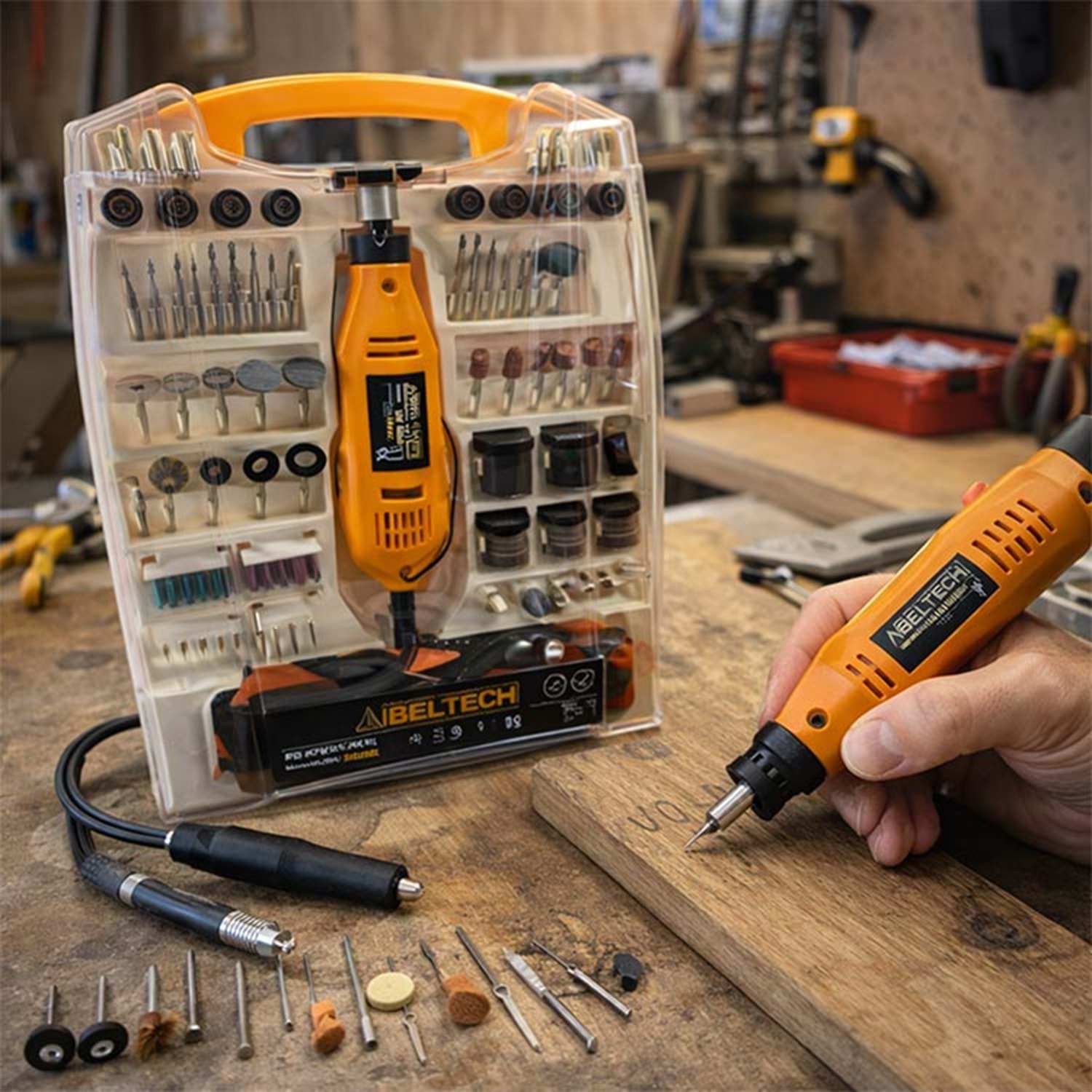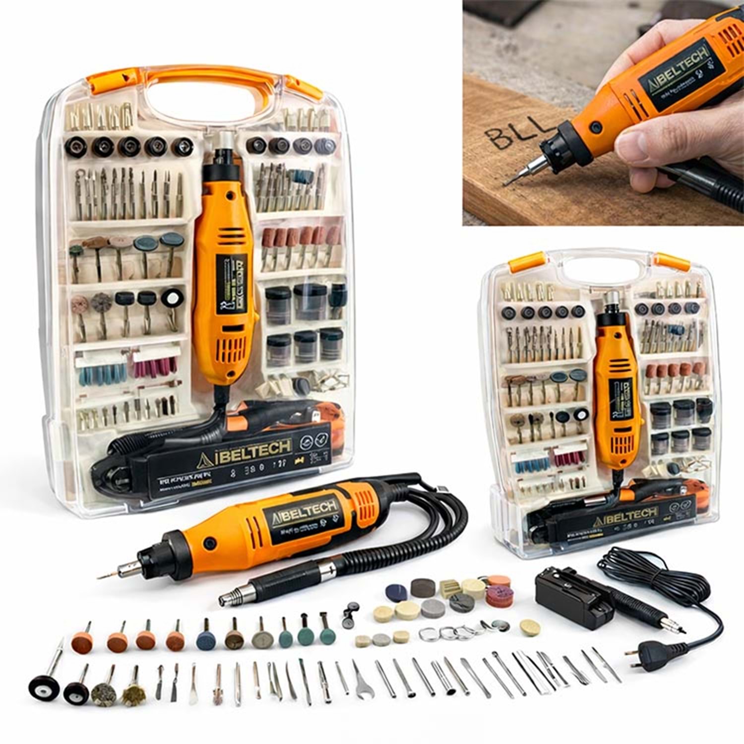 Gravür Seti 300 Parça Gravür Makinalı IBELTECH, içerisinde gravür makinası bulunan tam donanımlı bir settir. 130W güçlü motoru ve 3800-8000 dev/dk hız aralığı sayesinde ahşap, metal, plastik, cam ve benzeri yüzeylerde kesme, taşlama, zımparalama ve gravür işlemlerini kolayca yapabilirsiniz.