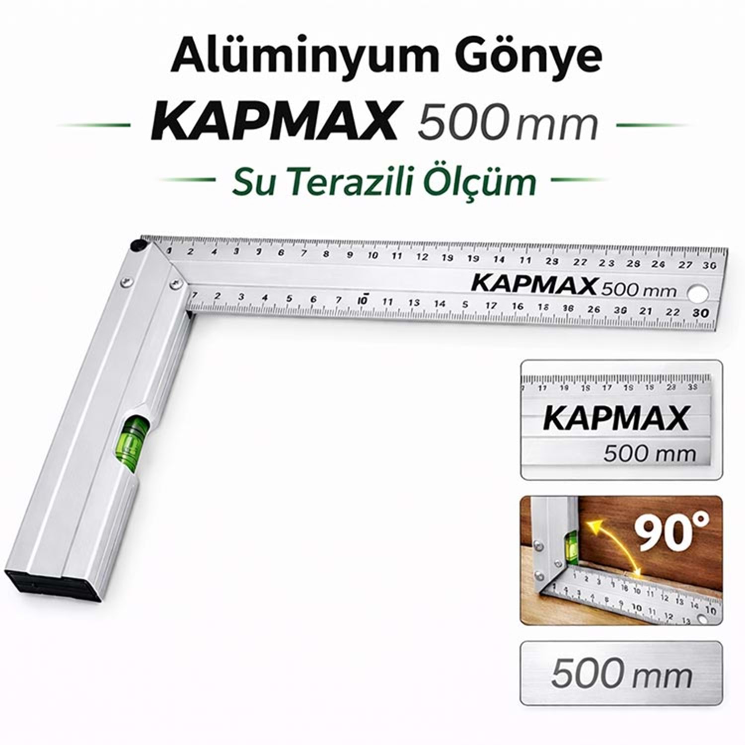 Kapmax 500 mm Alüminyum Gönye, geniş ölçüm alanı ve entegre su terazisi özelliği ile profesyonel kullanım için geliştirilmiştir. Dayanıklı ve hafif alüminyum gövdesi sayesinde uzun ölçümlerde bile konforlu ve hassas çalışma imkanı sunar.